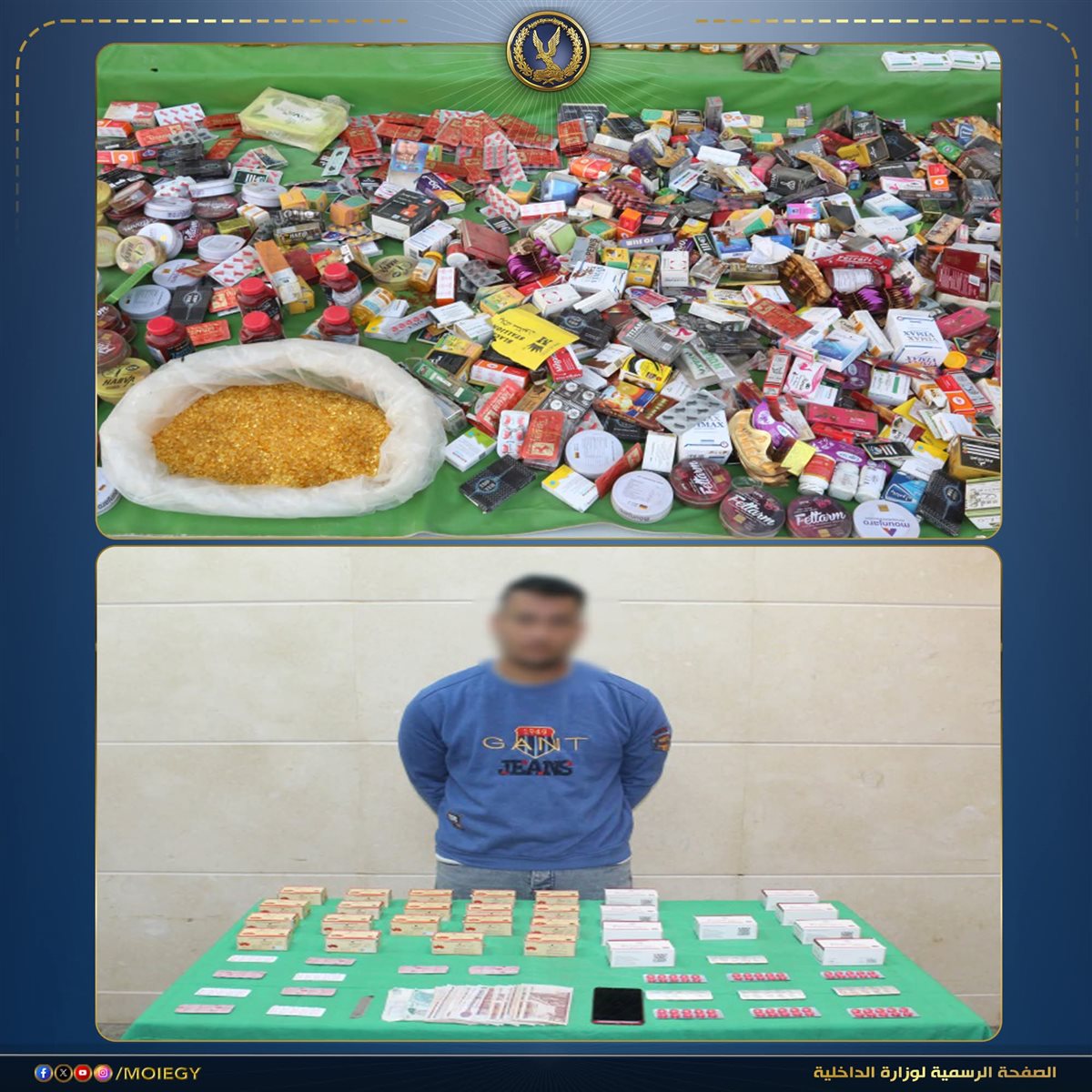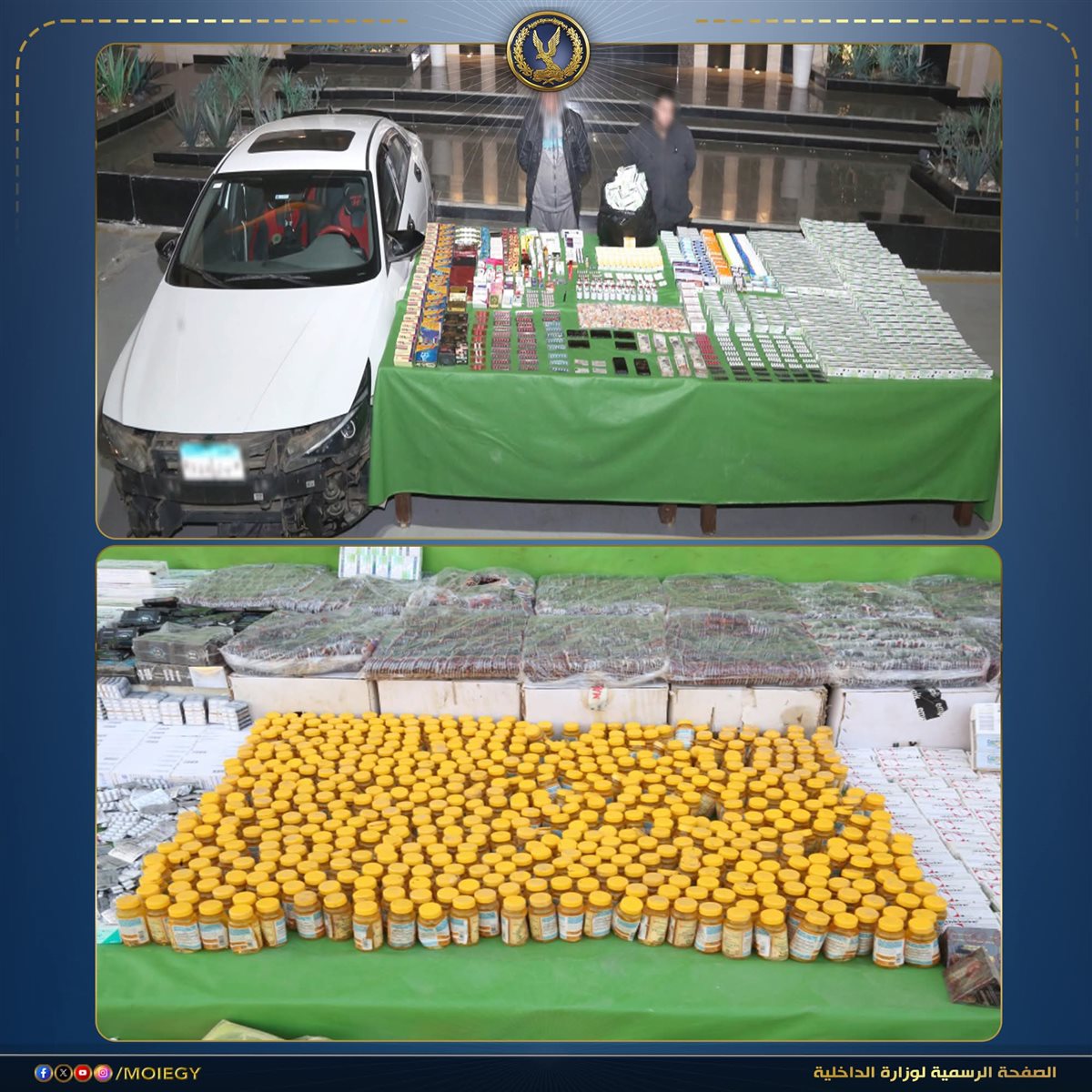 فى إطار مواصلة وزارة الداخلية توجيه الضربات الإستباقية للتشكيلات العصابية الإجرامية جالبى ومهربى المواد والأقراص المخدرة.. فقد أكدت معلومات وتحريات قطاع مكافحة المخدرات والأسلحة والذخائر غير المرخصة بالتنسيق مع جهات الوزارة المعنية قيام تشكيل عصابى يضم (4 عناصر إجرامية شديدة الخطورة) بجلب أقراص مخدرة ومؤثرة على الصحة النفسية والعصبية وإعادة تدويرها وخلطها تمهيداً لترويجها ، وإتخاذهم من دوائر قسمى ومركز شرطة (أول السلام، الشرابية، منوف) بنطاق محافظتى القاهرة والمنوفية مسرحاً لمزاولة نشاطهم الإجرامى.