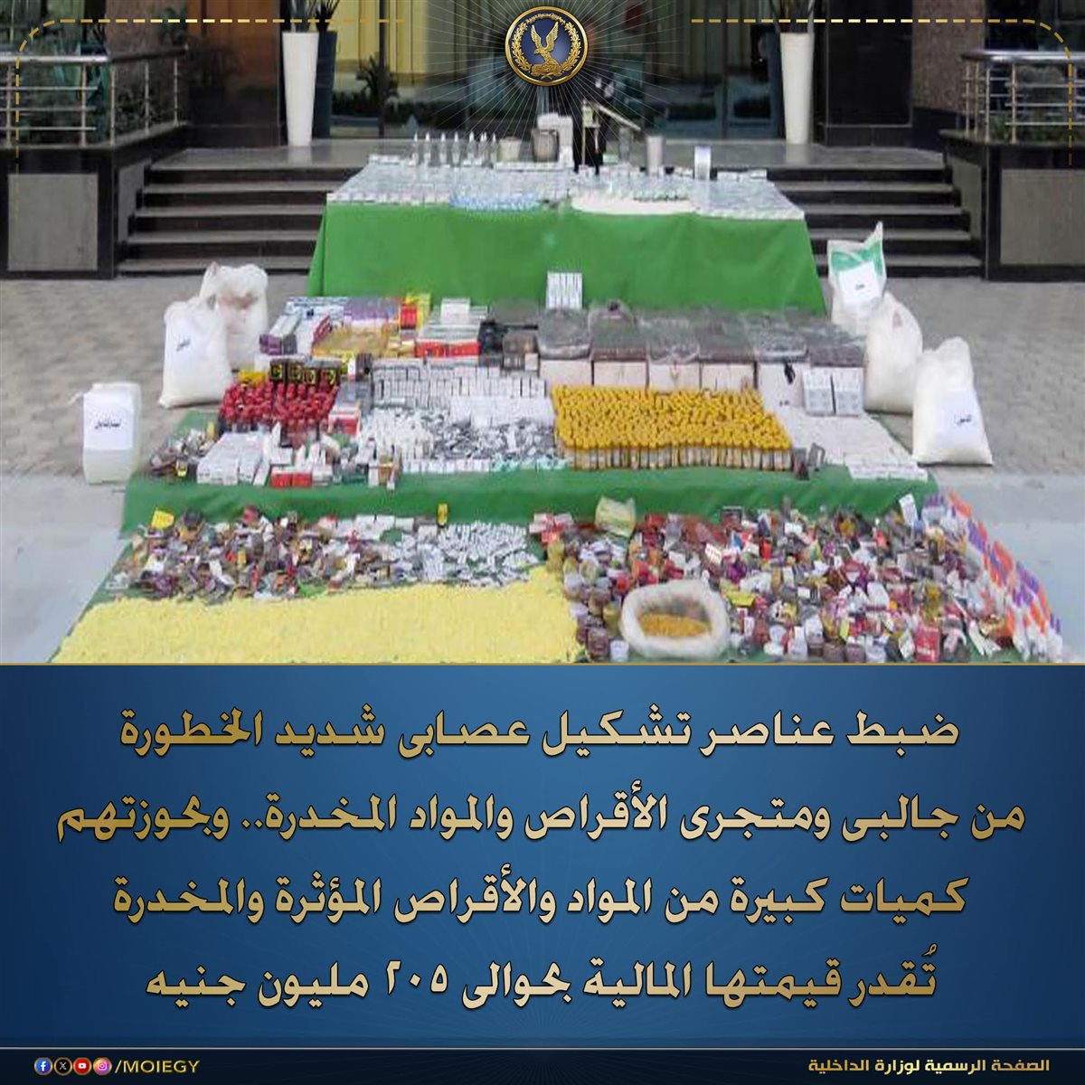 عقب تقنين الإجراءات تم إعداد الأكمنة اللازمة لهم وبإستهدافهم أمكن ضبطهم وبحوزتهم (قرابة 3 مليون قرص مؤثر ومخدر - 500 أمبول مخدر – كمية من مخدر الحشيش –الخامات والمواد والمعدات والأدوات المستخدمة فى تدوير وخلط المواد المخدرة) .. هذا وتقدر القيمة المالية للمواد المخدرة المضبوطة بحوالى (205 مليون جنيه) وتم إتخاذ الإجراءات القانونية