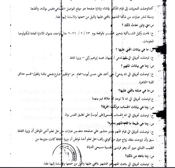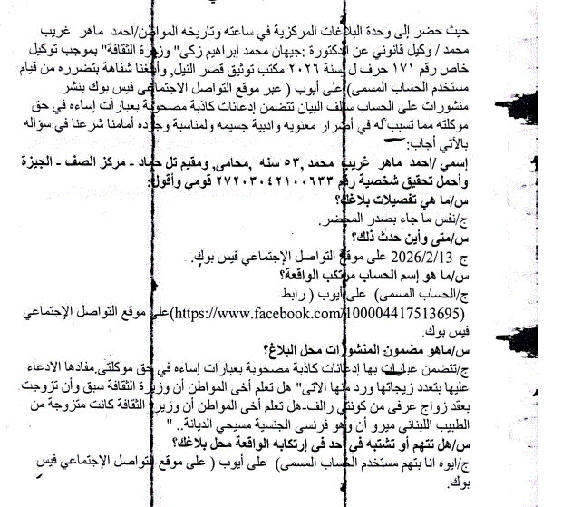 وأوضحت التحقيقات، أن صفحة الحساب المسمى "علي أيوب" الخاص بالمتهم تبين انها مفتوحة للجميع وبالبحث داخل الصفحة وجدنا عدة منشورات بتاريخ ٢٠٢٦/٢/١٣ مضمون الأول " زواج وزيرة الثقافة من الطبيب اللباني ميرو ان وهو فرنسي الجنسية مسيحي الديانه وابنتها مايا تحمل الديانه المسيحية والجنسية الفرنسية وتم الانفصال بينهم، ومضمون المنشور الثاني زواج وزيرة الثقافة من مدحت ميشيل جرجس صاحب شركة خدمات عامة ونقل المخارج والمتهم في قضية الآثار الكبرى والتي ضبطت في إيطاليا ومضمون الثالث - حصول وزيرة الثقافة على وسام فارس من الطبقة الوطنية من فرنسا عن دورها في شرح ثقافة الحضارات اثرت في العالم عن حقوق المثلين في التحول التخسي والفكري تقرباً للالهة " ومضمون الرابع " تكريم الوزيرة من منظمة اليونسكو العالمية تقديرا لاسهامتها في مجالات حق القليين في الحياة بدون ملاحقة والتأكيد على ان الفرعونيه والاشورية من القدم الحضارات التي اكدت حقوق المثليين " ومضمون الخامس " عمل الوزيرة بالجامعات الفرنسية مدرسة علم المصريات المقارن بالمخالفة للقوانين المصرية " مضمون السادس " ان الوزيرة تحمل الجنسيتين الفرنسية والايطالية" مضمون مضمون السابع انها كانت متهمه في القضية رقم ٢٠٢٥ لسنة ١٩٩٨ بالاتجار في الآثار المصرية و انها قامت باستخدام نفوذها لاخلاء سبيلها وبمواجهة المتهم اقر بانها صفحته الشخصية علي موقع.\