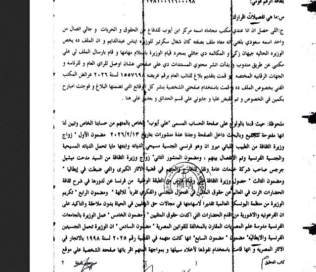ج: اللي حصل ان انا عندي مكتب محاماه اسمه مركز ابن أيوب للدفاع عن الحقوق والحريات و جالي اتصال من واحد اسمه سعودي بلغني أنه معاه ملف بصفته كان شغال سكرتير للوزيره ايناس عبدالدايم و ان الملف ده يخص الوزيره الحاليه جيهان زكي و المكالمه دي جاتلي بمجرد قيام الوزيرة باستلام مهامها و قام بارسال الملف لي علي مكتبي عن طريق مندوب و بدأت انشر محتوي المستندات دي علي صفحتي عشان اوصل للراي العام و للرئاسه و الجهات الرقابية المختصه و قمت بتقديم بلاغ للنائب العام برقم عريضه ١٥٥٧٦٩٨ لسنة ٢٠٢٦ عرائض المكتب الفني بخصوص الملف ده.