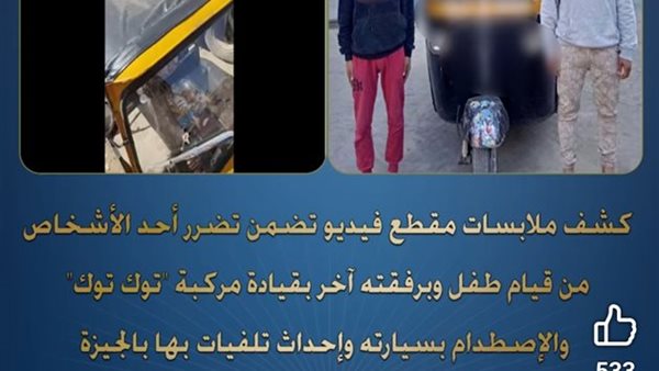 كشف وزارة الداخلية ملابسات مقطع فيديو تم تداوله بمواقع التواصل الإجتماعى تضمن تضرر أحد الأشخاص من قيام طفل وبرفقته آخر بقيادة مركبة "توك توك" والإصطدام بسيارته وإحداث تلفيات بها بالجيزة.
