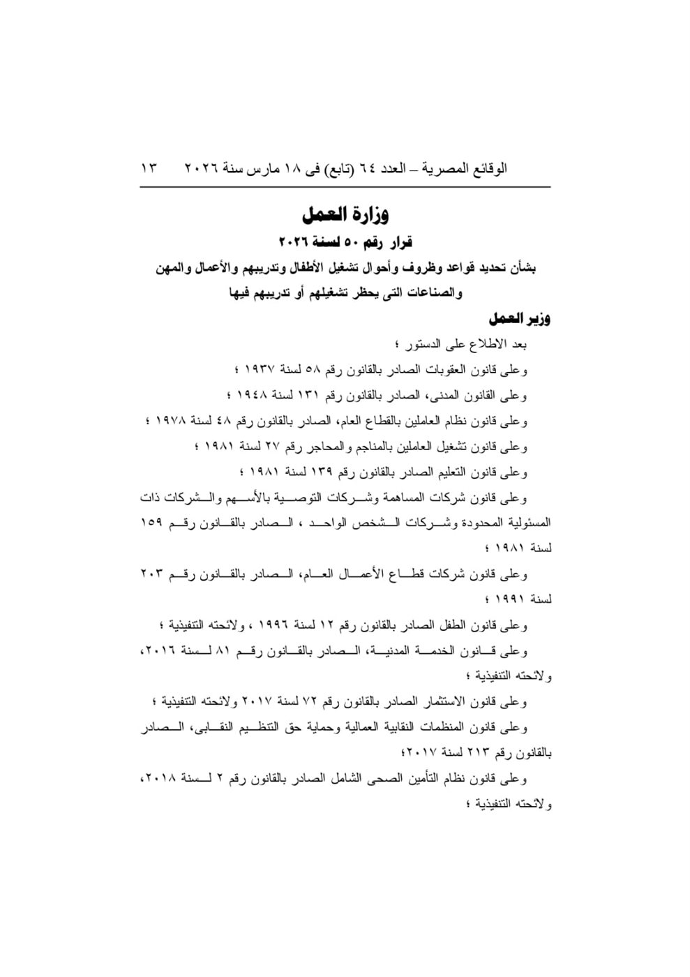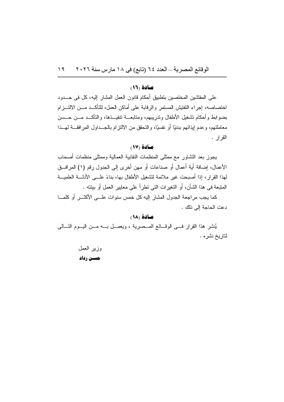 أصدر حسن رداد، وزير العمل، القرار الوزاري رقم 50 لسنة 2026 بشأن تنظيم قواعد تشغيل وتدريب الأطفال وحظر عملهم في المهن الخطرة، وذلك في إطار تعزيز الحماية القانونية للأطفال بما يتوافق مع أحكام الدستور ، وقانون العمل، والمعايير والاتفاقيات الدولية ذات الصلة.