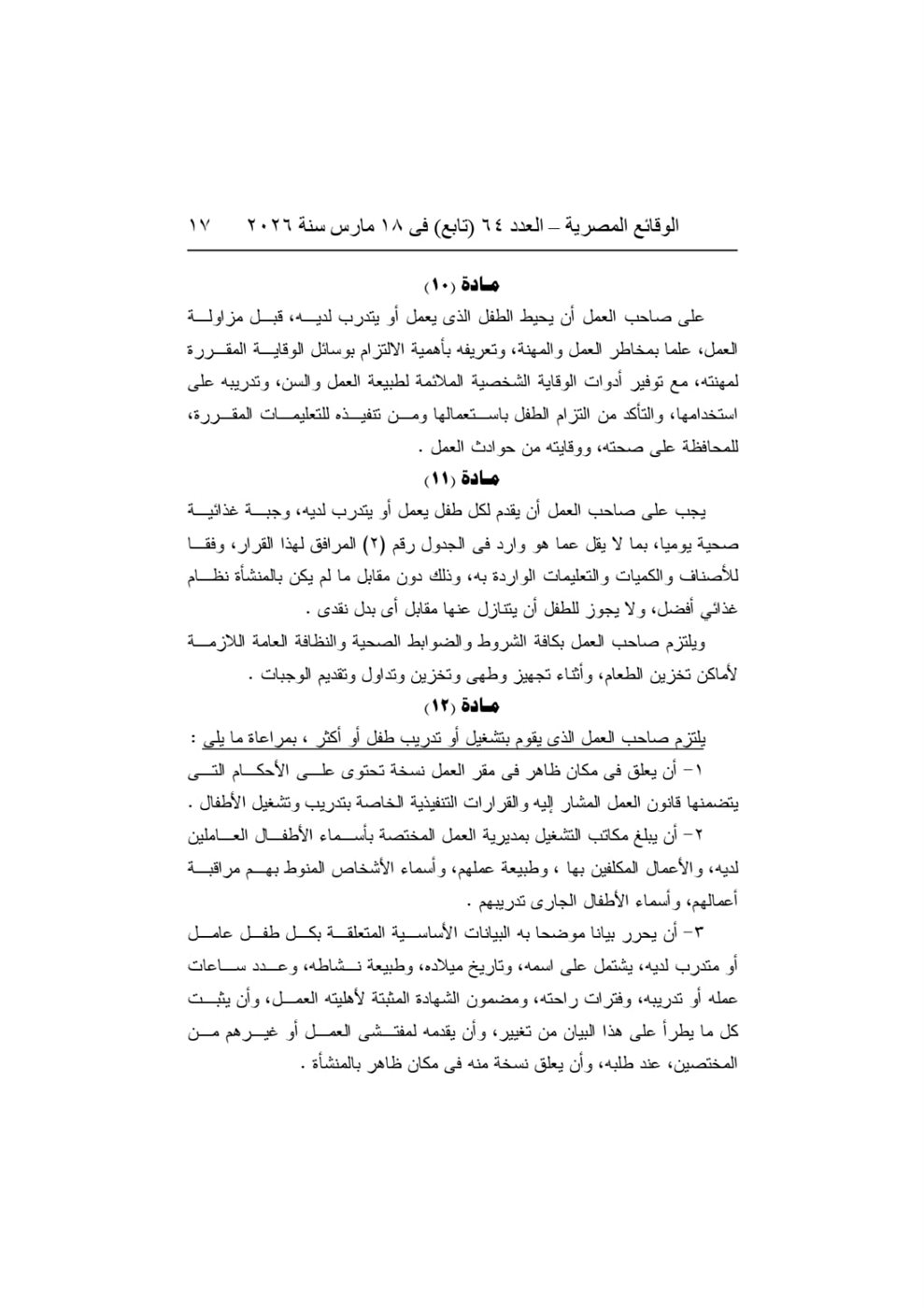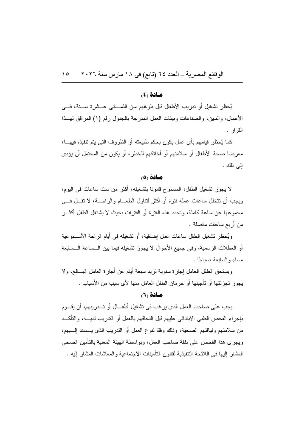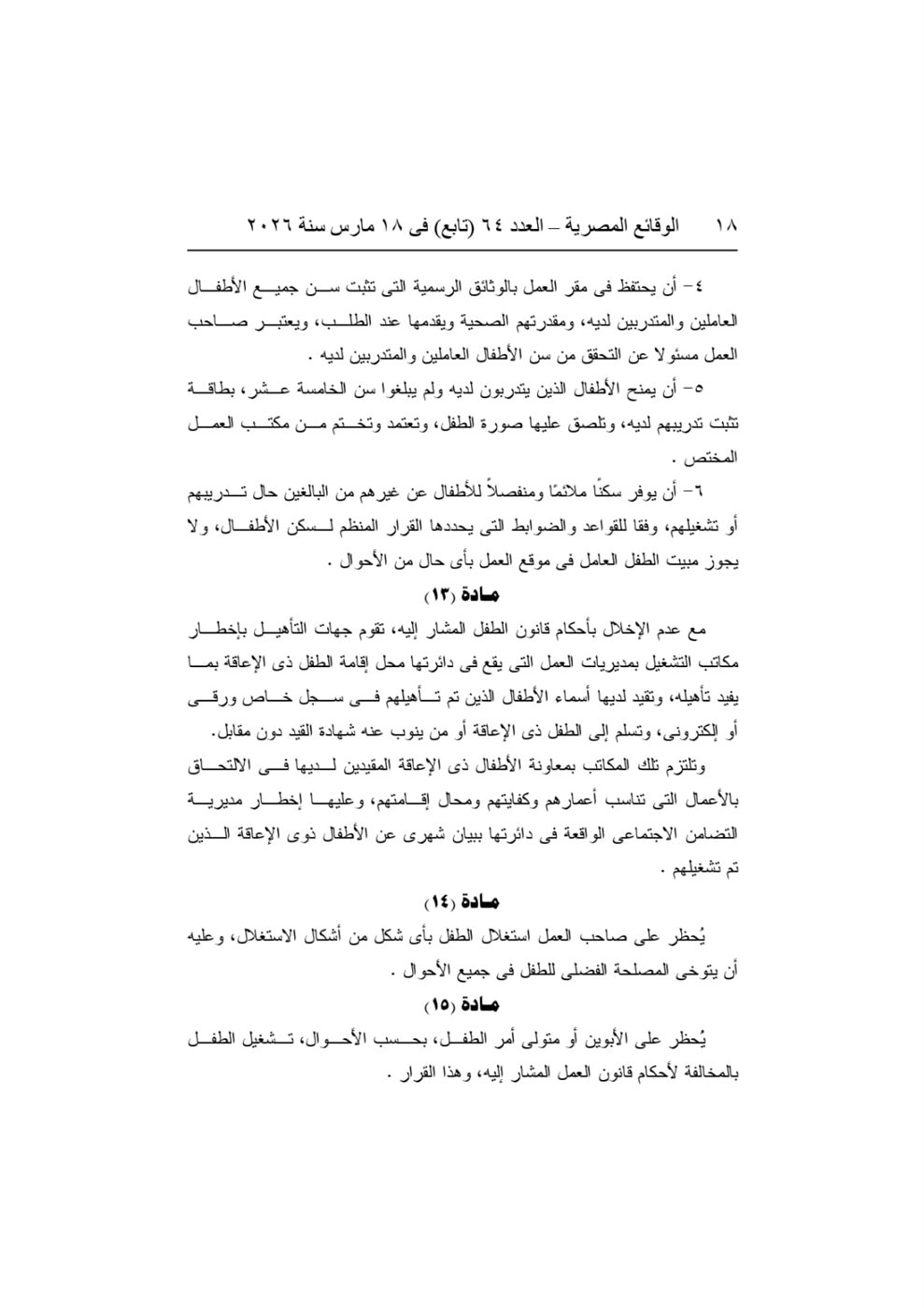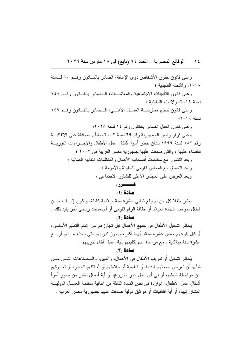 ونص القرار على حظر تشغيل الأطفال قبل إتمام مرحلة التعليم الأساسي أو قبل بلوغ سن 15 عامًا، مع السماح بتدريبهم مهنيًا اعتبارًا من سن 14 عامًا وفق ضوابط محددة تكفل حمايتهم وضمان عدم الإضرار بصحتهم أو تعليمهم.
