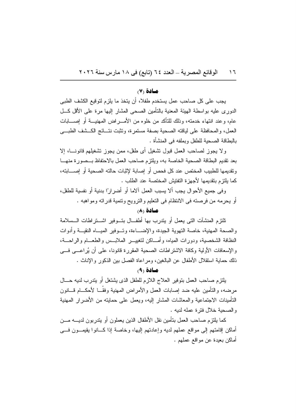 كما حدد القرار ساعات عمل الأطفال - المسموح لهم بالعمل - بما لا يتجاوز 6 ساعات يوميًا، مع منع تشغيلهم لساعات إضافية أو تكليفهم بالعمل خلال أيام الراحة الأسبوعية والعطلات الرسمية، إلى جانب حظر تشغيلهم ليلاً في الفترة من السابعة مساءً حتى السابعة صباحًا.