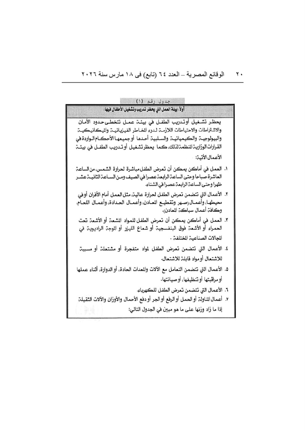وتضمن القرار قوائم تفصيلية بالمهن الخطرة التي يُحظر تشغيل الأطفال بها نهائيًا، حفاظًا على سلامتهم الجسدية والنفسية، ومن بينها العمل في المناجم والمحاجر، وبعض الأعمال في صناعة الأسفلت والمنسوجات،والتعامل مع المواد الكيماوية أو النفايات الخطرة.. كما حدد القرار الأوزان والحمولات المسموح للأطفال بحملها بما يتناسب مع قدراتهم البدنية، بما يضمن توفير بيئة عمل آمنة.