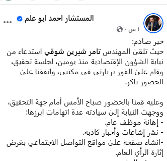 نشر المحامي أحمد أبو علم على صفحة بموقع التواصل الإجتماعي منشورا قال فيه أن النيابة العامة قررت حبس تامر شيرين شوقي 4 أيام علي ذمة التحقيقات لاتهامه بنشر أخبار كاذبه